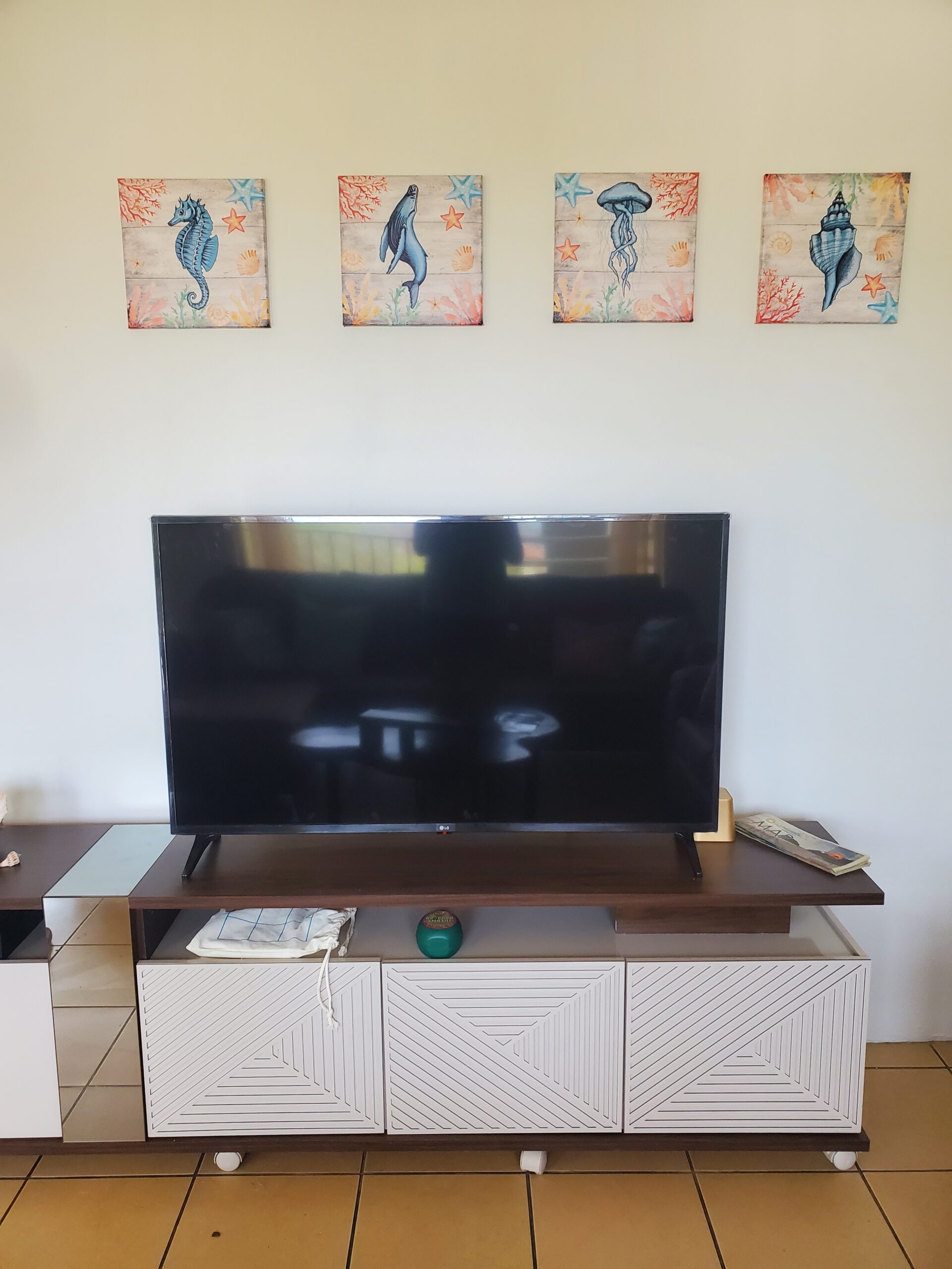 52” television has cable channels as well as streaming channels. You have choice of Spanish or English on Netflix. Television controls are in English.